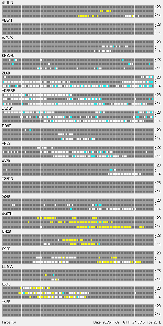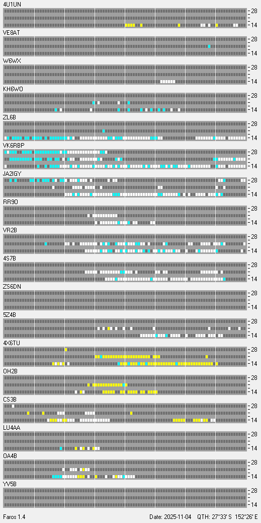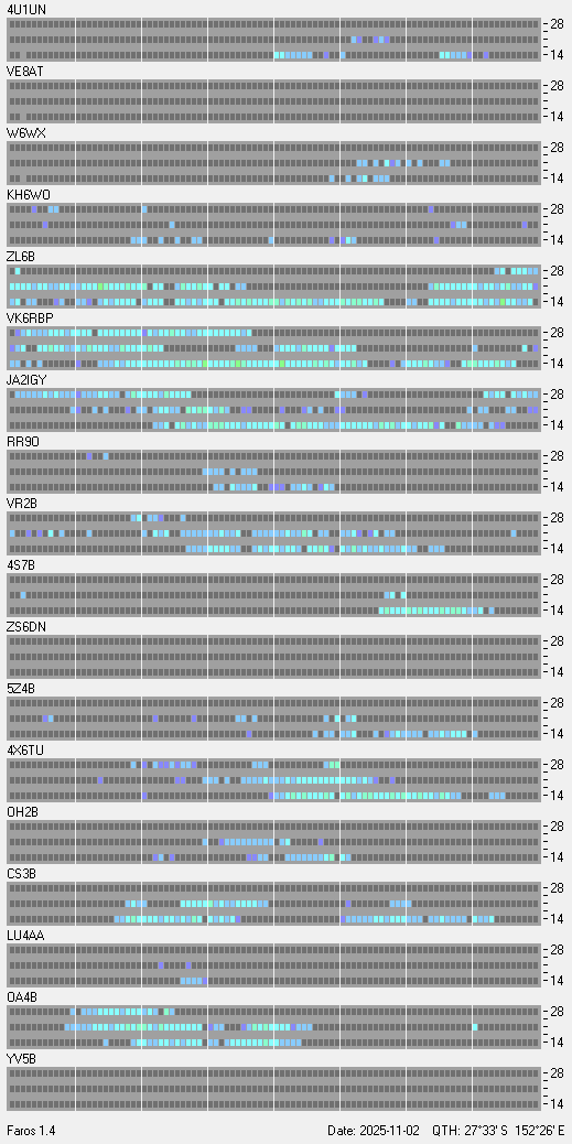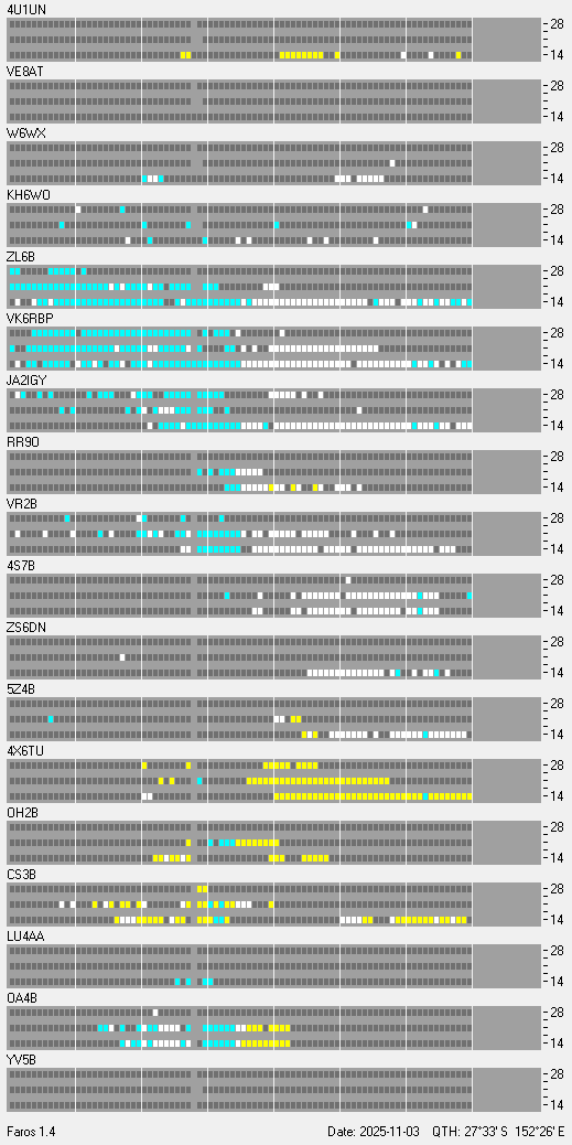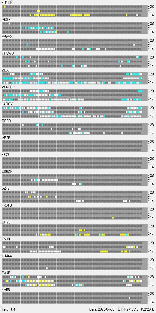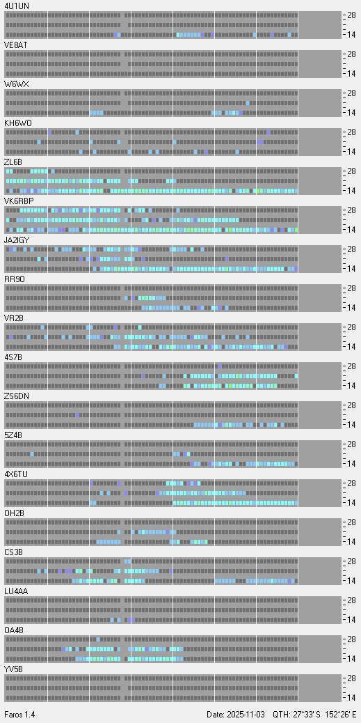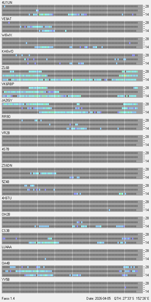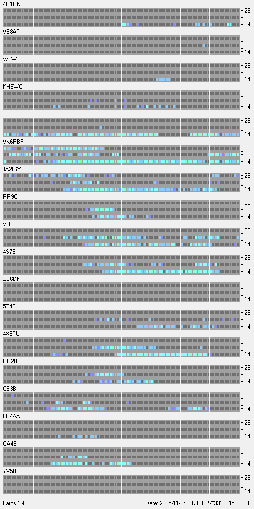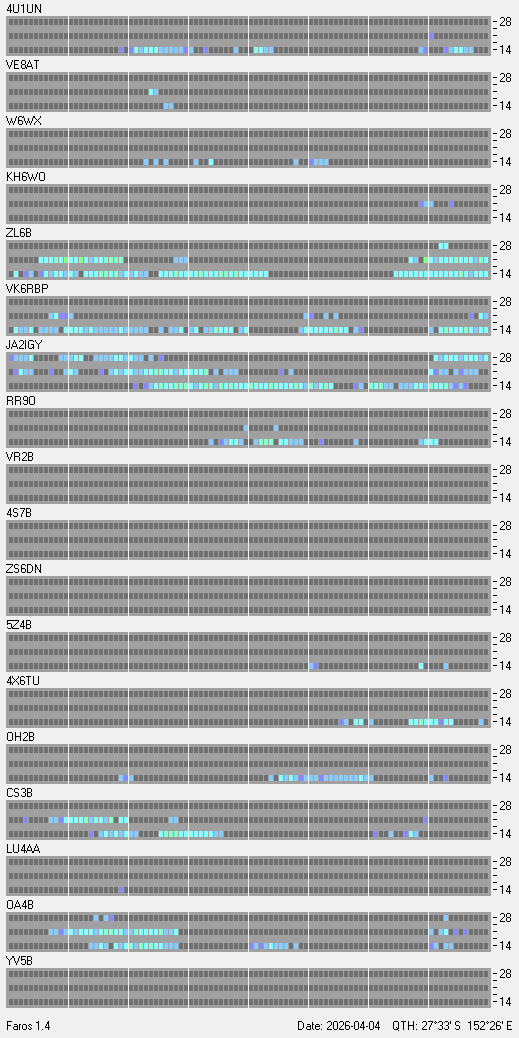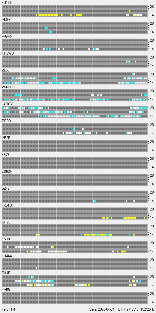 Beacon Reception at VK4SNScroll down to see the charts. Updated every 15 minutes-- ON AIR -- Missing data is due to storms, contesting, or other activities that would interfere with data collection at my QTH.Each beacon transmits once on each band once every three minutes, 24 hours a day. A transmission consists of the callsign of the beacon sent at 22 words per minute followed by four one-second dashes. The callsign and the first dash are sent at 100 watts. The remaining dashes are sent at 10 watts, 1 watt and 100 milliwatts. At the end of each 10 second transmission, the beacon steps to the next higher band and the next beacon in the sequence begins transmitting.